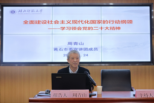 会议邀请到黄石市学习贯彻党的二十大精神市委宣讲团成员周青山教授来校专题宣讲二十大精神。周青山教授以《全面建设社会主义现代化国家的行动纲领》为题,以二十大主题为纲,从深刻领会过去5年工作和新时代10年伟大变革、深刻领会开辟马克思主义中国化时代化新境界、深刻领会中国式现代化的中国特色和本质要求、深刻领会全面建设社会主义现代化国家的重大战略部署、深刻领会坚持党的全面领导以及全面从严治党等五个方面,分别阐释了全面建设社会主义现代化国家的基础条件、指导思想、路径方式、战略部署和领导力量。报告重点突出、脉络清晰、生动形象、切合实际,对我们更准确的理解和全面把握党的二十大精神具有重要的指导意义。