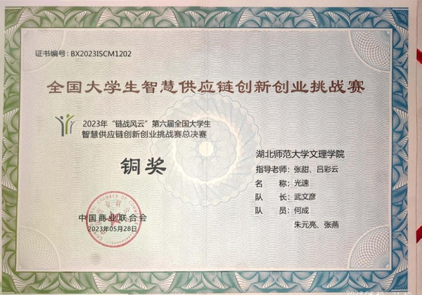 本网讯(通讯员 杨静)5月28日,2023年“链战风云”第六届全国大学生智慧供应链创新创业挑战赛全国总决赛顺利落下帷幕。万搏(中国)经管学部张甜、吕彩云老师指导,武文彦,何成、朱元亮、张燕组成的光速队获得了本科组团体总决赛铜奖,挑战赛一等奖;杨林海、全永鑫、谢显根、黄颜彪组成的四个葫芦娃队获挑战赛三等奖,创造了万搏(中国)参与此项赛事以来的最好成绩。