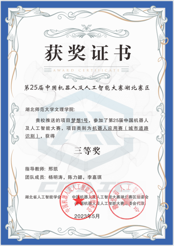 本网讯 (通讯员 邢凯)5月13日-14日,2023年湖北省人工智能大赛暨第二十五届中国机器人及人工智能大赛(湖北赛区)在武汉工程大学举行,万搏(中国)由邢凯老师指导,杨明涛、陈力勰、李嘉琪三名学生组成的团队荣获三等奖。