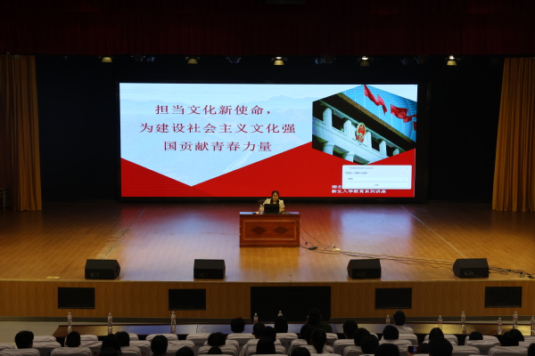 胡蕾从社会主义文化强国的提出、新时代我国文化强国建设新境遇、为建设社会主义文化强国贡献力量三个方面展开,以其扎实的理论功底和独到的视角对“建设社会主义文化强国”这一问题展开详尽解读,并运用近期热点《逃出大英博物馆》、《黑神话:悟空》等文化产品来阐述坚定文化自信的重要。她强调,作为新时代的大学生,应在文化强国建设、助力民族复兴大业的进程中,自觉肩负使命,努力学习科学文化知识,将中华优秀传统文化与时代精神相结合,讲好中国故事、传播好中国声音,自觉抵制各种错误思潮,勇于担当尽责,积极作为,做出贡献。她指出,更好担负起新的文化使命,需要青春力量,需要充分发挥青年人的积极性、主动性、创造性。