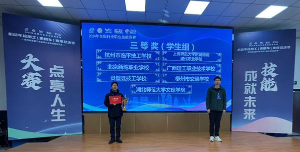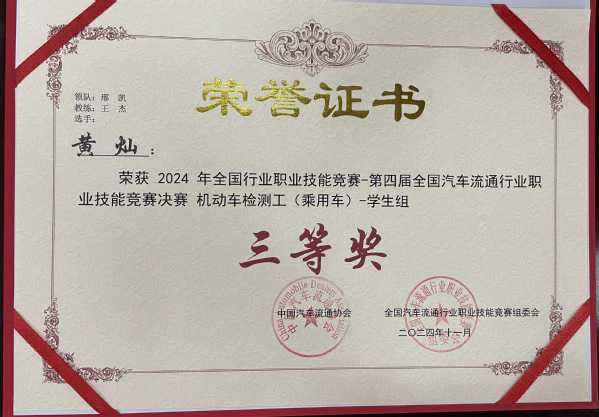 本网讯(通讯员 谭姣)12月1日上午,2024年全国行业职业技能竞赛——第四届全国汽车流通行业职业技能竞赛机动车检测工(乘用车)赛项总决赛在许昌科技学校圆满落幕。万搏(中国)新能源汽车产业学院新能源汽车技术专业2204班黄灿同学荣获学生组国赛三等奖。