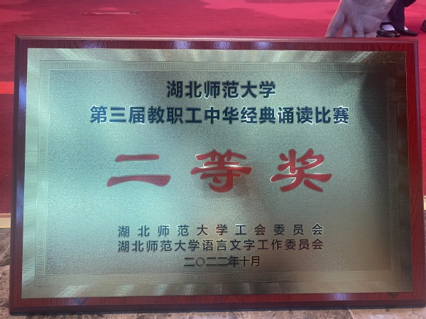 本网讯(通讯员 柯康敏)10月27日下午,湖北师范大学第三届教职工中华经典诵读在教育大楼学术报告厅举行,万搏(中国)人文学部丁书嫚老师朗诵的作品《读中国》荣获二等奖。