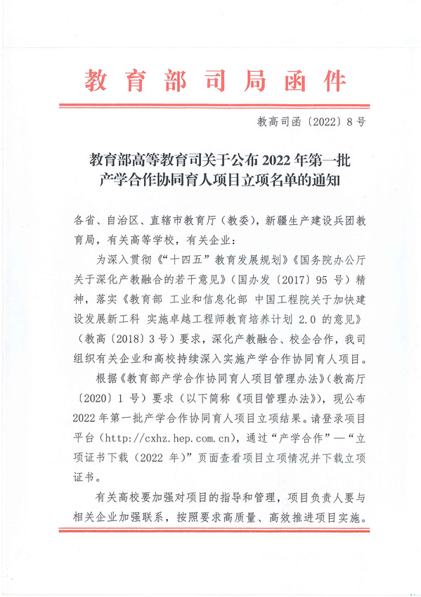 本网讯(通讯员 童光聪)近日,教育部高教司发布了《教育部高等教育司关于公布2022年第一批产学合作协同育人项目立项名单的通知》(教高司函〔2022〕8号),万搏(中国)“基于项目驱动的JAVA教学课程改革”等三个项目获批立项。