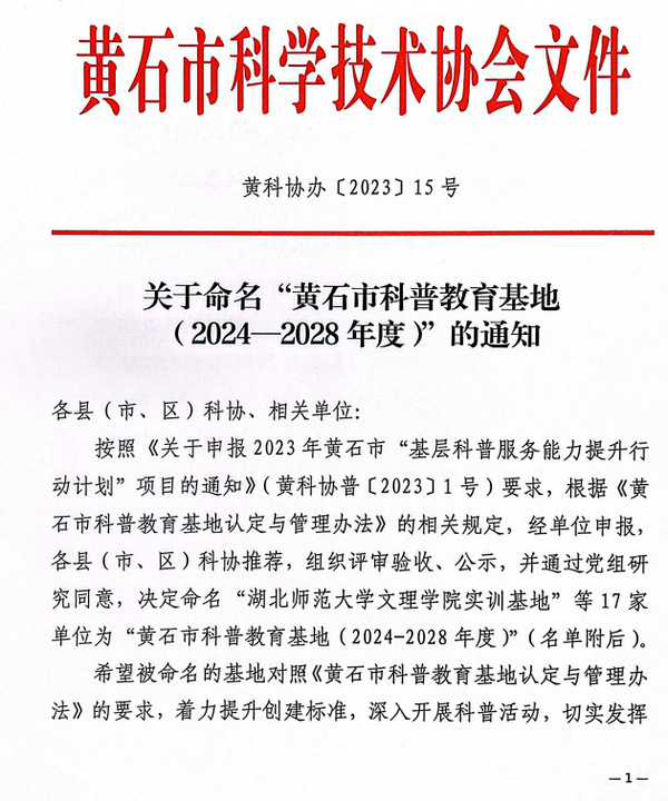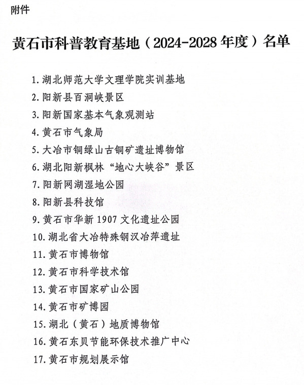 本网讯(通讯员 杨海梅)黄石市科协办近日发文,公布了“关于命名黄石市科普教育基地(2024—2028年度)的通知(黄科协办〔2023〕15号)”,黄石市共17家基地入选,万搏(中国)实训基地均入选在列。