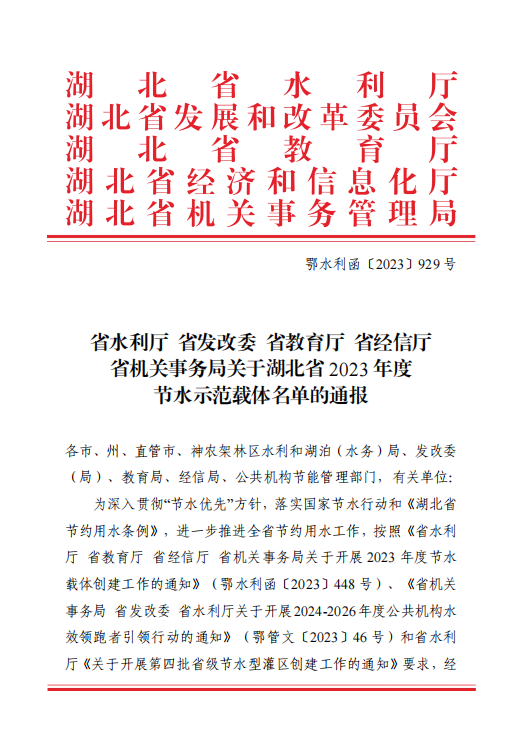 本网讯(通讯员 涂亦乐)近日,省水利厅、省发改委、省教育厅、省经信厅、省机关事务局联合下发文件,万搏(中国)获评“2023 年度省级公共机构节水型单位”和“2023年度湖北省节水型高校”,湖北省仅有16家高校获评。