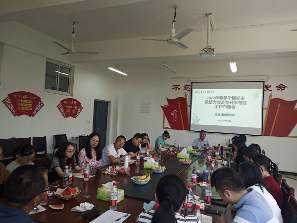 2022616日下午2点半,经济与管理学部于2号实验楼213会议室,召开了学部春季学期期末总结大会及专升本考试工作布置会,本次会议由学部主任商树松主持,学部全体教职员工参加。主要内容如下:1.树松主任传达学校对2022年专升本考试的工作要求和指示精神,要求各位老师认真遵守考试纪律;2.专业负责人、教研室主任、教学办、行政办、学工办负责人对上半年来的工作进行总结;3.各专任教师相互交流,为学部发展建言献策;4.树松主任作最后总结肯定学部2022年上半年以来工作所取得的成绩,同时也指出工作中存在的问题和不足,提出了要求与建议,并对暑假以及下半年的工作进行了安排和部署。