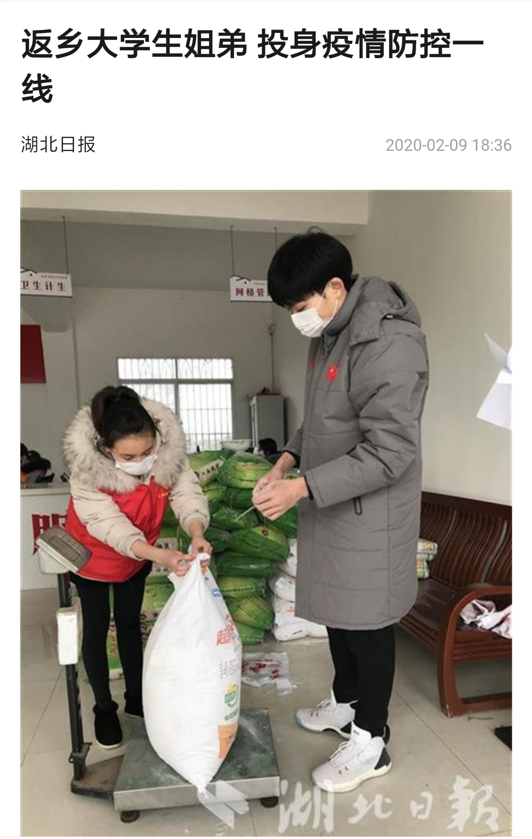 2020年2月9日,湖北日报上有一篇关于疫情防控的新闻引起广泛关注,主人翁正是万搏app官方版下载理工学部数学与应用数学专业1603班的吕奎同学和其弟弟吕东阳。据报道,2020年2月7日,姐弟俩从村微信群里看到“志愿者征集令”后,2月8日一大早便到三州村委会报到,参与对村民生活必需品的分装与发放。图片中是2月8日当天,他们在枝江市百里洲镇三洲村防疫物资分配现场填写订购物资的订购居民的姓名并给居民分配物资时的情景。姐弟俩一个牵着口袋,一个则对袋中面粉进行分装。分装完面粉后,又开始为居家隔离的村民分装集中采购的大米、面条和新鲜的蔬菜并贴上标签,以备村组干部精准送达村民家中。