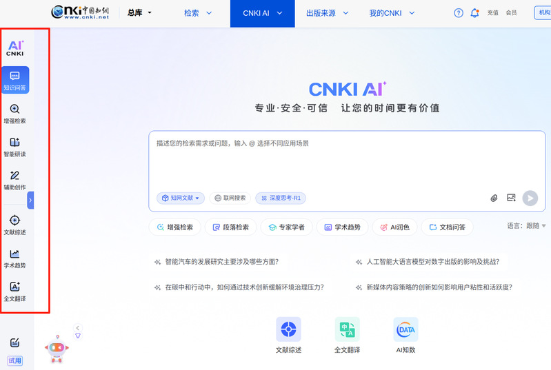 CNKI AI,是中国知网全面拥抱AI,赋能知识服务的全新探索,是推进问答式增强检索和生成式知识服务的场景实践。平台基于AI技术驱动的专业知识+深度思考、可信增强+可控生成的智能化服务,全面融合AI学术研究助手和AI增强检索,理解更加精准全面,解答更有专业深度,构建人工智能时代学术研究、科技创新、科学决策、全民阅读和人才培养的新范式。