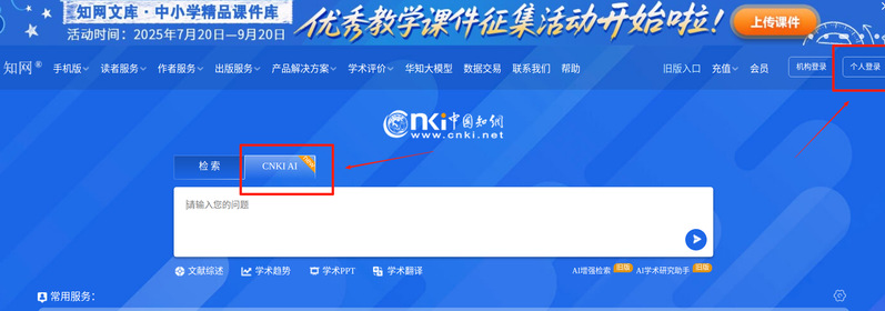 访问方式:登录知网首页www.cnki.net,后切换至CNKI AI进入。右上角机构登录显示“万搏app官方版下载”后,点击右上角“个人登录”,注册/登录个人账号后登录使用。