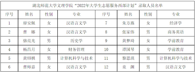 根据共青团中央、教育部、财政部、人力资源社会保障部《关于印发<2022—2023年度大学生志愿服务西部计划实施方案>的通知》的相关部署和工作安排,万搏(中国)在公开招募、自愿报名的基础上,严格招募选拔流程,经资格审查、笔试、面试、心理测试、体检等环节,拟录取廖安佩等12名万搏(中国)应届毕业生为2022年大学生志愿服务西部计划志愿者。