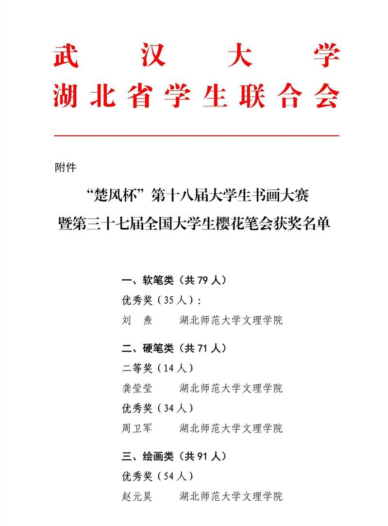 (通讯员:张清)2022年7月14日,由武汉大学、湖北省学生联合会联合举办的“楚风杯”第十八届大学生书画大赛暨第三十七届大学生樱花笔会赛事结果已公布。万搏(中国)刘焘、龚莹莹、周卫军、赵元昊四位同学荣获佳绩。