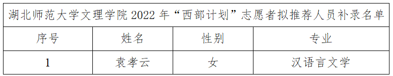 因学生自愿放弃,万搏(中国)开展了2022年“西部计划”志愿者拟推荐人员补录工作。现将补录名单公示如下: