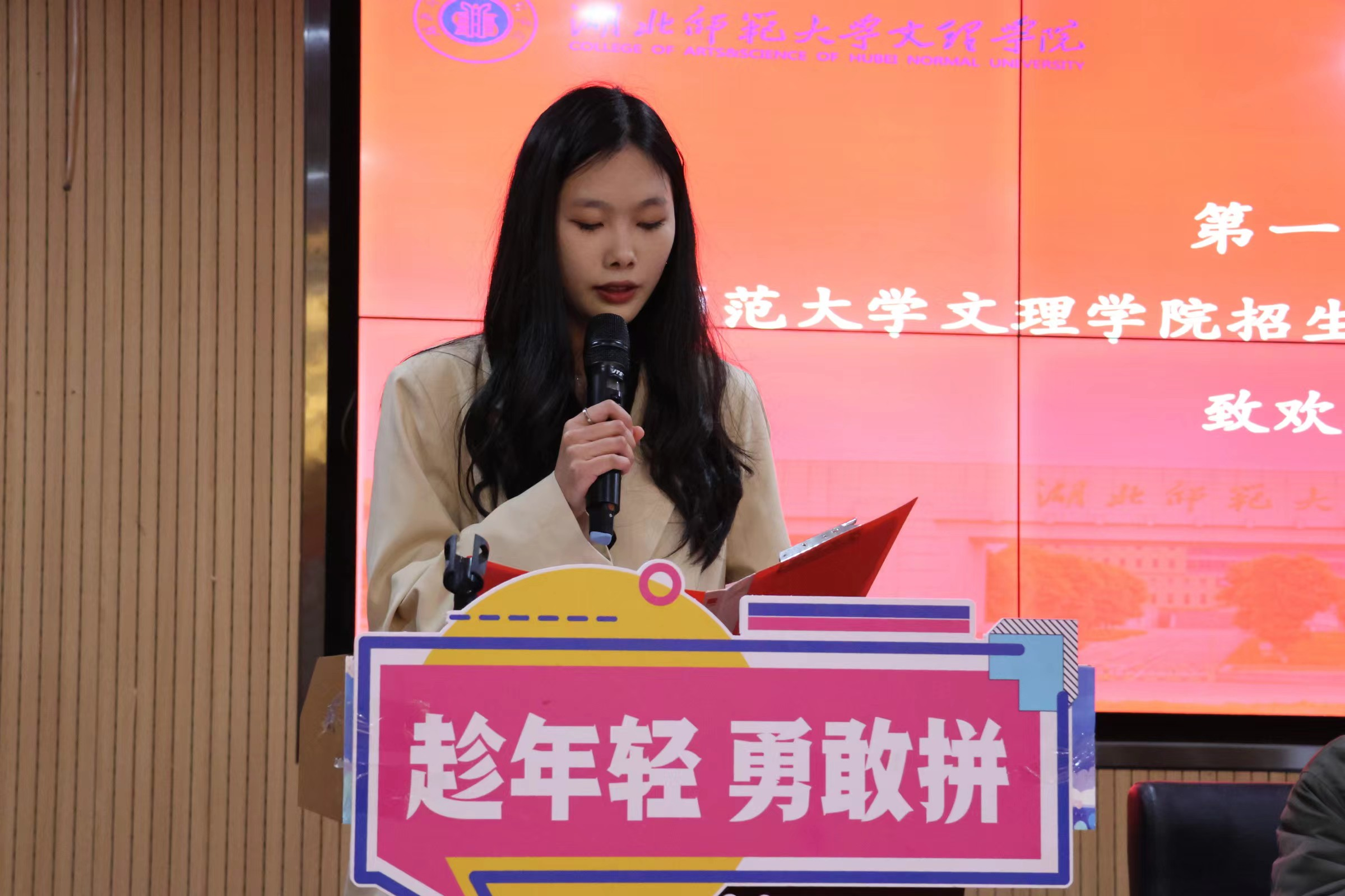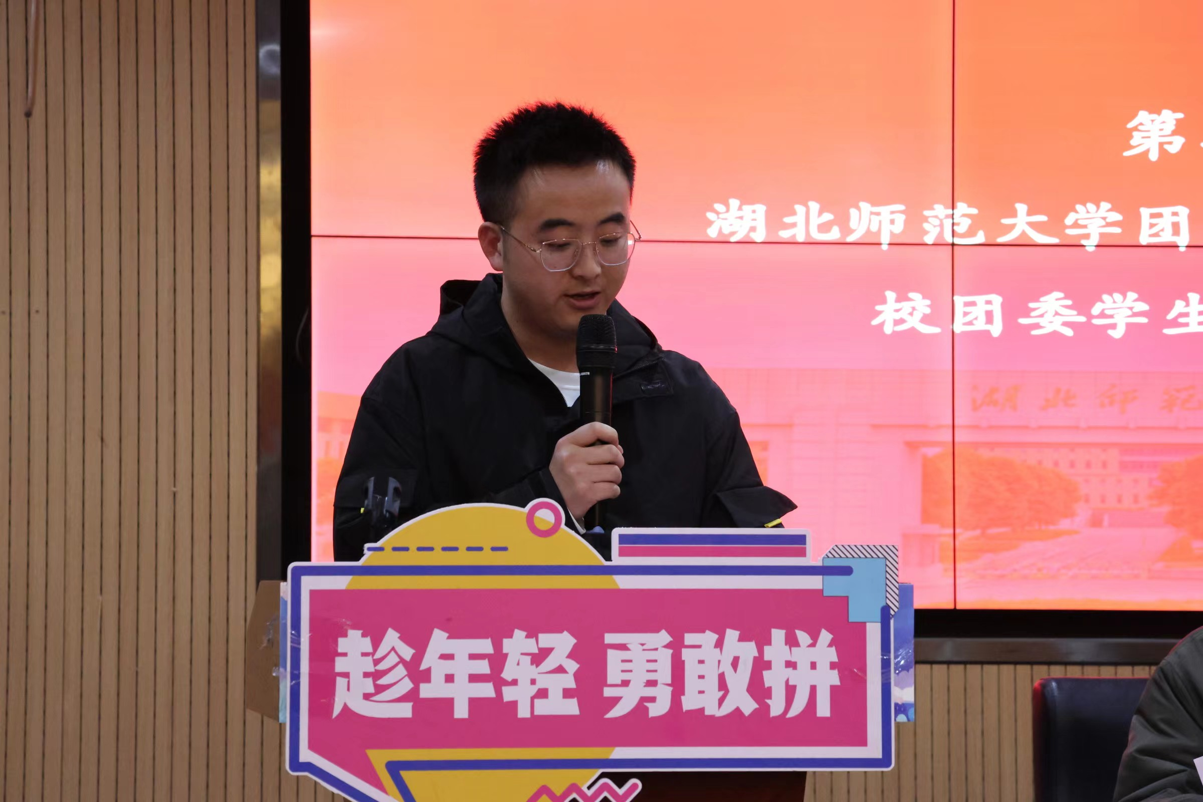 会议第二项,湖北师范大学校团委学生副书记黄凯龙发言,他通过总结湖北师范大学一直以来的发展方针及所获的荣誉向大家分享三点经验:一是坚持以习近平新时代中国特色社会主义思想为指导,全面贯彻党的二十大精神,深入学习习近平总书记关于青年工作的重要思想,持续开展青年大学习和团日活动;二是坚持服务中心大局,紧扣服务青年工作生命线,引导广大团员青年学生在社会课堂上就教育长才干做贡献;三是坚持专业专精,锤炼过硬本领,以自身激情感染广大青年,以自身能力引领青年群众。