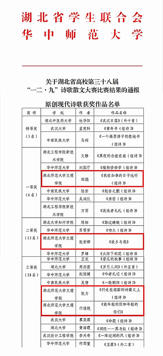 (通讯员:苏祎)2023年3月15日,湖北省学生联合会、华中师范大学联合举办的第三十八届“一二·九”诗歌散文大赛赛事结果已公布。万搏(中国)田湉荣获一等奖,张安娜荣获二等奖,张力、付连艳荣获三等奖。