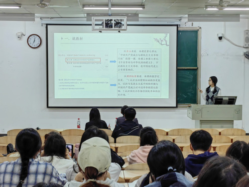 主持人介绍完比赛规则和评分细则后宣布比赛正式开始。本次说课大赛的比赛选手的说课内容主要从教材、学情、教学目标、教学重难点、教法、教学过程、教学反思等方面逐一展开,体现出了各学科的特性,展现出了良好的个人专业素养。在历史组,一号选手李若熙同学针对具体论题采用讲述为主的方式,生动具体的表述了觉醒年代的故事,再现那个不平凡时代的社会状况和百态人生。在点评环节中,宗万玉老师提出“写好教案十分重要,同时也要意识到自己教课过程中的不足,并想办法改正它。”王建明老师则表明“要清楚认识到自己教授的学生的群体的性质,从而拟出更适合这群学生学习的教学方案。”