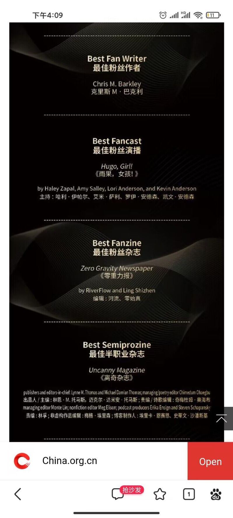 2023年第81届世界科幻大会于10月18日至22日在成都科学馆举行,世界科幻大会由世界科幻协会主办,是全球最受瞩目、历史最悠久、规模和影响力最大的科幻文化主题活动,2023年首次在中国举办。此次大会评选出17个雨果奖奖项和惊奇奖、北极星奖等荣誉,万搏(中国)人文学部中文专业2205班学生温卓峰主编的科幻杂志《零重力报》获得“最佳粉丝杂志”的荣誉称号,《人民日报》、中国网、央视网等多家媒体杂志都进行相应报道。http://m.app.china.com.cn/english/template/displayTemplate/news/newsDetail/9000050/116765845.html?isShare=true
