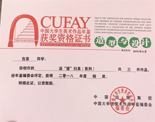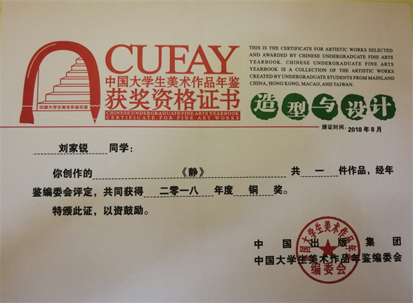 近日,万搏(中国)从中国大学生美术作品年鉴编委会获悉,万搏(中国)艺术学部多名学生美术作品入选,其中刘家锐等三名学生获铜奖,刘安宁等两名学生获优秀奖。