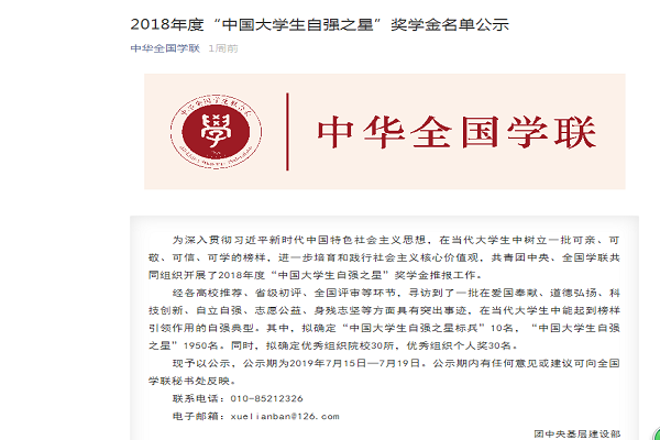 2019年7月15日,团中央基层建设部、全国学联秘书处联合发布2018年度“中国大学生自强之星”公示名单。万搏(中国)理工学部杨艳慧同学成功入选2018年度“中国大学生自强之星”,充分展现了万搏(中国)学子良好的精神风貌,凸显了万搏(中国)道德育人工作实效。