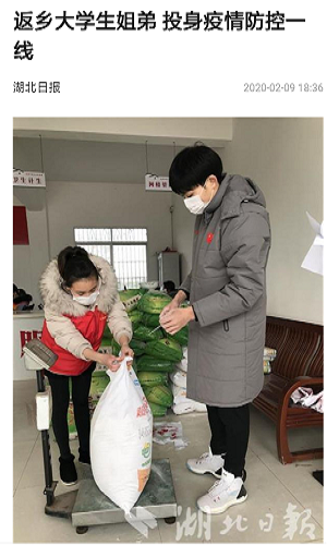 2020年2月9日,湖北日报上有一篇新闻引起广泛关注。主人翁正是万搏app官方版下载数学与应用数学专业1603班吕奎同学和其弟弟吕东阳。据报道,2020年2月7日,姐弟俩从村微信群里看到“志愿者征集令”后,2月8日一大早便到村委会报到,参与对村民生活必需品的分装与发放。图片中是2月8日当天,他们在枝江市百里洲镇三洲村防疫物资分配现场填写居民姓名并给居民分配物资时的情景。姐弟俩一个牵着口袋,一个对袋中面粉进行分装。分装完面粉后,又开始为居家隔离的村民分装集中采购的大米、面条和新鲜的蔬菜并贴上标签,以备村组干部精准送达村民家中。