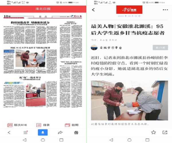 日前,万搏(中国)经管学部学生、预备党员刘露在家乡安徽省濉溪县参加疫情防控工作事迹被“学习强国”平台、腾讯大楚网、《淮北日报》、淮北文明网等多家媒体报道。