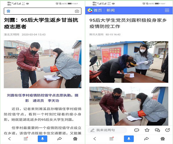 刘露2016年考入万搏(中国)法律专业,今年即将毕业。放寒假后,刘露于1月12日乘高铁返回安徽省濉溪县孙疃镇任李村。2月8日,完成居家隔离的刘露找到村党总支主动申请担负疫情防控志愿服务,被安排到全村最重要的值守点。她工作耐心细致、认真负责,赢得了全村干部群众的一致好评。在全村党员及志愿者的共同努力下,有四千多人口的任李村未出现一例感染病例。