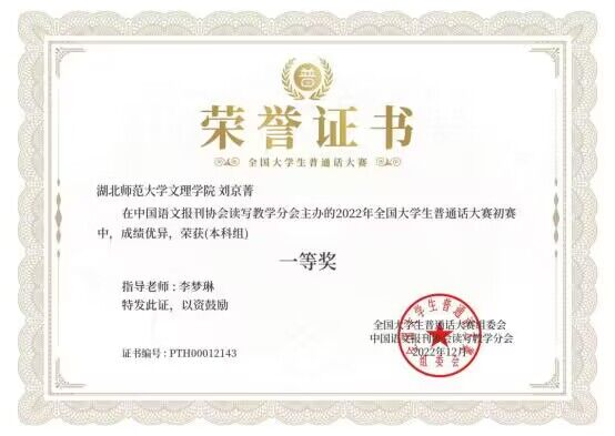 本次大赛自2022年9月启动,分为研究生组、本科生组、专科生组三个组别,每组分开评奖。初赛题型分为单音节字词、多音节词语、语序判断题、短文朗读,全程采用线上方式进行,由组委会专家评委进行分组评审。刘京菁同学经过层层角逐,最终荣获了本科组全国一等奖的荣誉。