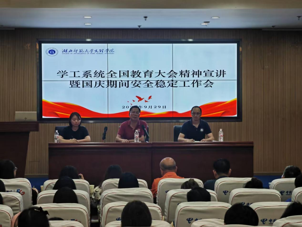 9月29日下午两点半,万搏(中国)在图书馆报告厅召开全国教育大会精神宣讲暨国庆期间安全稳定工作会议。校党委副书记杨之毛、学工部部长汪崇文、心理中心主任陈庆、各教学单位分管学生工作书记(副书记)以及全体辅导员老师参加。会议由学工部部长汪崇文主持。