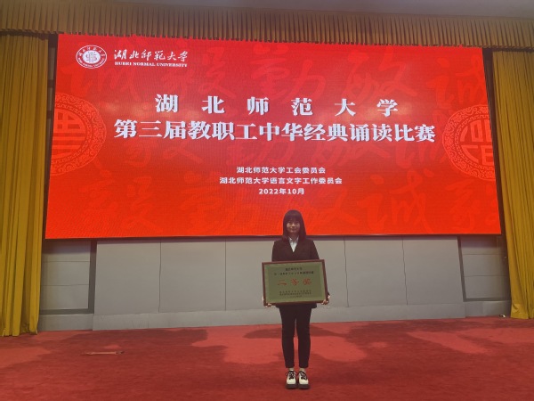 本网讯(通讯员 柯康敏)10月27日下午,湖北师范大学第三届教职工中华经典诵读在教育大楼学术报告厅举行,万搏(中国)人文学部丁书嫚老师朗诵的作品《读中国》荣获二等奖。