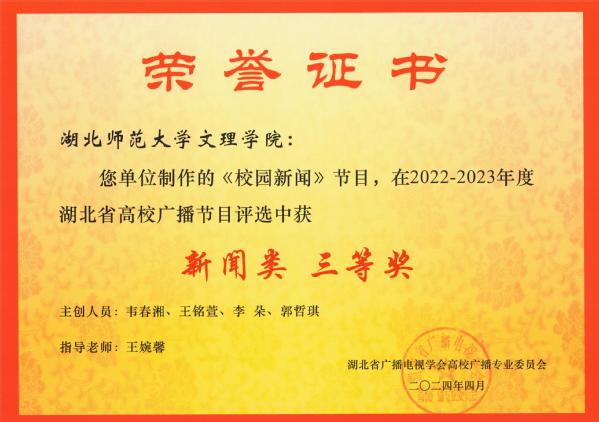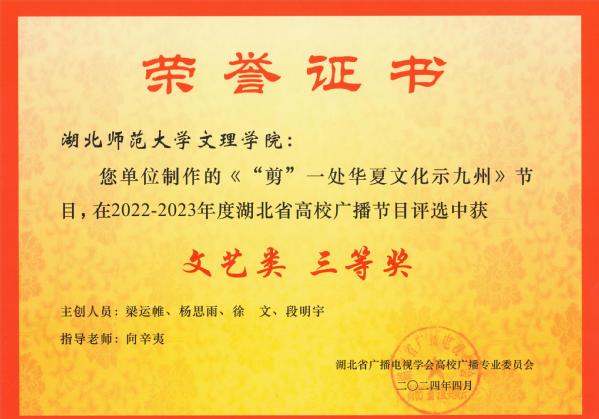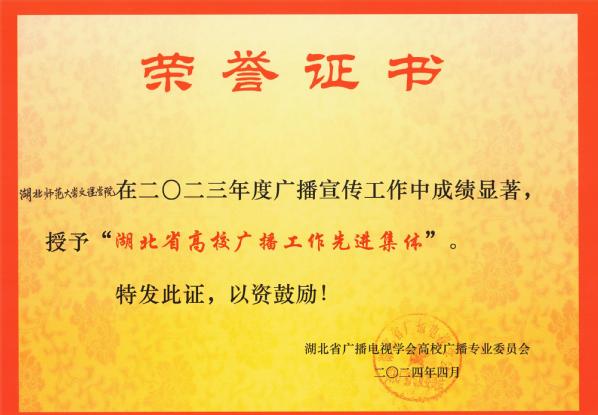 本网讯(通讯员 张慧萍)4月19日,全省高校广播专业委员会工作会议在湖北经济学院召开。会议通报了2022-2023 年度湖北省高校广播节目评选结果,万搏(中国)广播台获“湖北省高校广播工作先进集体”的荣誉称号,向辛夷老师指导的《“剪”一处华夏文化示九州》节目,荣获“文艺类”三等奖,王婉馨老师指导的《校园新闻》节目,荣获“新闻类”三等奖。