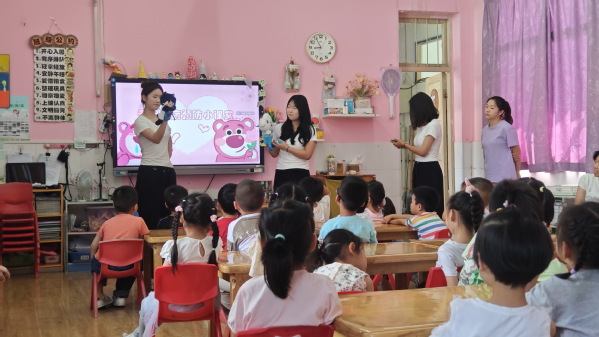 实践环节中,学生代表精心设计了互动教学方案。通过卡通图片展示、玩偶情景剧表演和洗手歌教学等形式,生动形象地向小朋友们讲解了手足口病、水痘等常见儿童传染病的传播途径与预防知识。现场小朋友兴奋地说:“姐姐演的小病毒太有趣了!我现在知道打喷嚏要捂住嘴巴啦!”在随后的趣味手工活动中,学生带领孩子们用画笔画下属于自己的“健康小卫士”。活动现场充满欢声笑语,孩子们在游戏互动中掌握了健康知识。