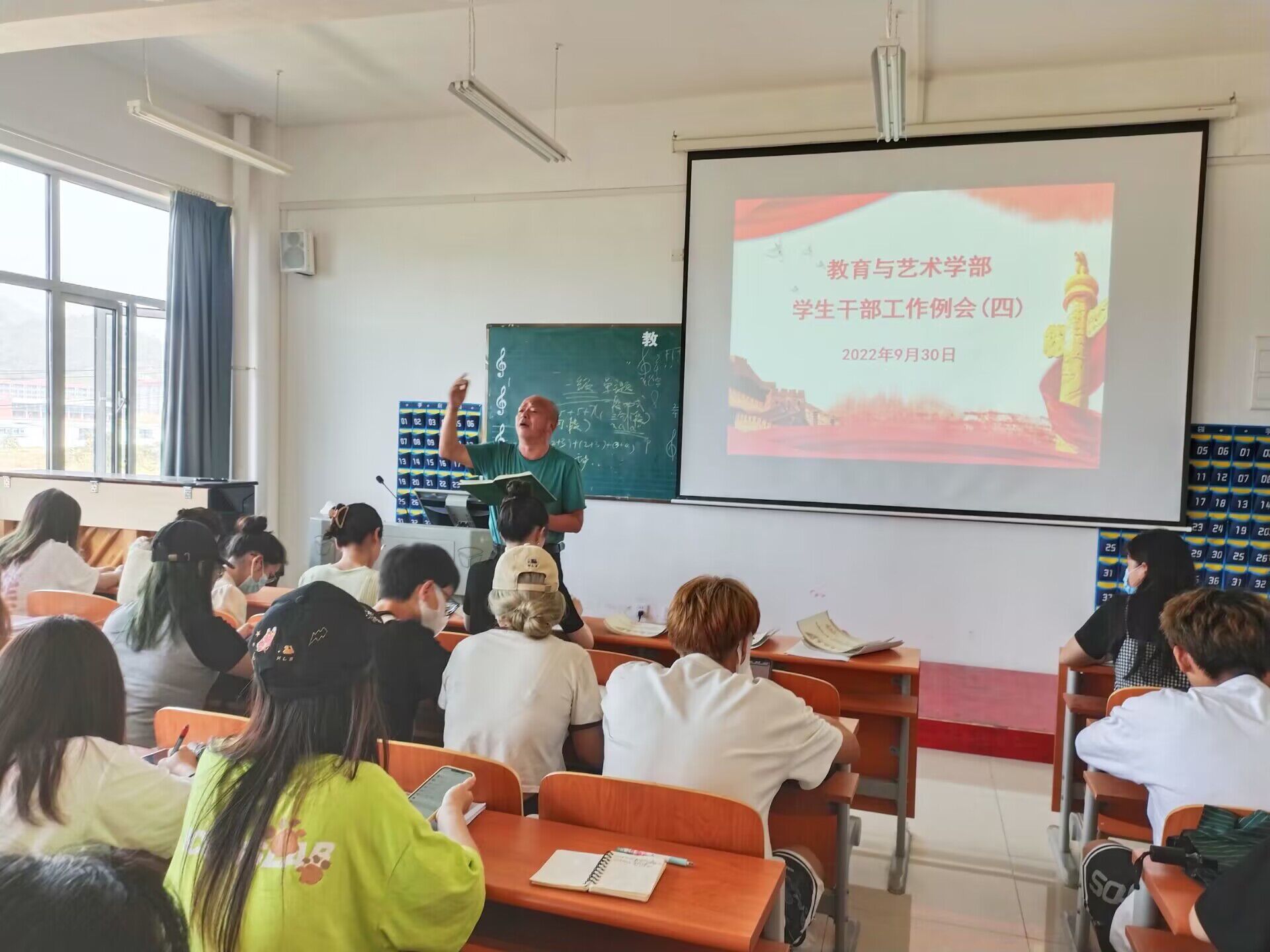 20229301200,在实验楼1-403多媒体教室召开学生干部工作例会,全体辅导员、团学会干部,及各专业班级负责人参加例会。学部总支书记李先华主持本次会议。