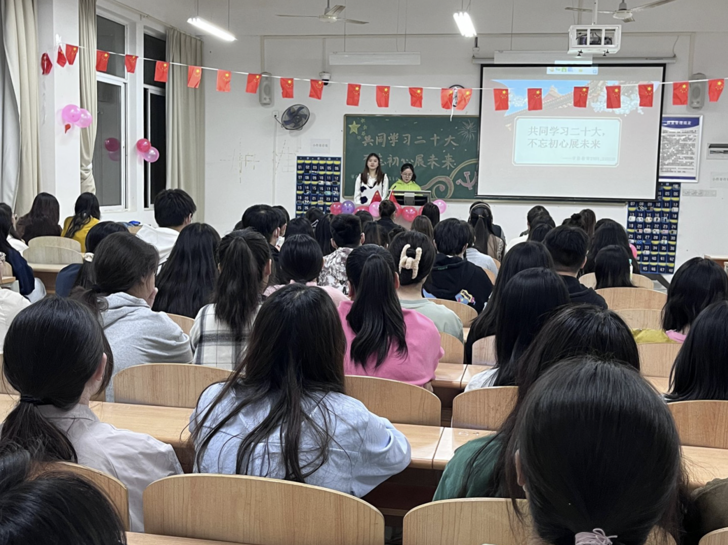 在团日活动中,各专业班级集体奏唱团歌,以黑板板画、PPT两种形式紧紧围绕“共同学习二十大,不忘初心展未来”为主题观看学习视频、谈心得体会。按照学校疫情防控要求,同学们全程佩戴口罩,活动在严肃活泼、紧张有序的氛围中取得圆满成功。