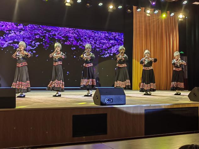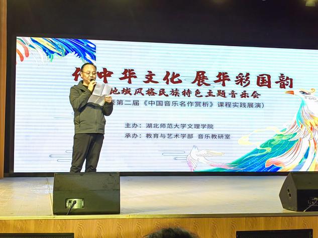 此次课程实践展演活动由学部主任王文教授的致辞拉开帷幕。音乐会开始以一首原汁原味的民歌《直尕思得》向大家展现了土家族的豪放与洒脱。随后,乐器演奏环节也是精彩纷呈,古筝演奏有白族风格的《蝴蝶泉边》、江苏民歌《茉莉芬芳》、瑶族风格《瑶族舞曲》、汉族器乐曲《春江花月夜》,吉他演奏有四川民歌《康定情歌》,清脆素雅的古筝、柔和饱满的吉他使得曲子更加生动。紧接着晚会以不同民族的歌曲充分展现了不同地域的少数民族歌曲的特色,他们以独特的表演形式博得了阵阵喝彩。最后全体演出人员共同演唱《爱我中华》,此次“传中华文化,展华彩国韵”地域风格民族特色主题音乐会圆满结束。