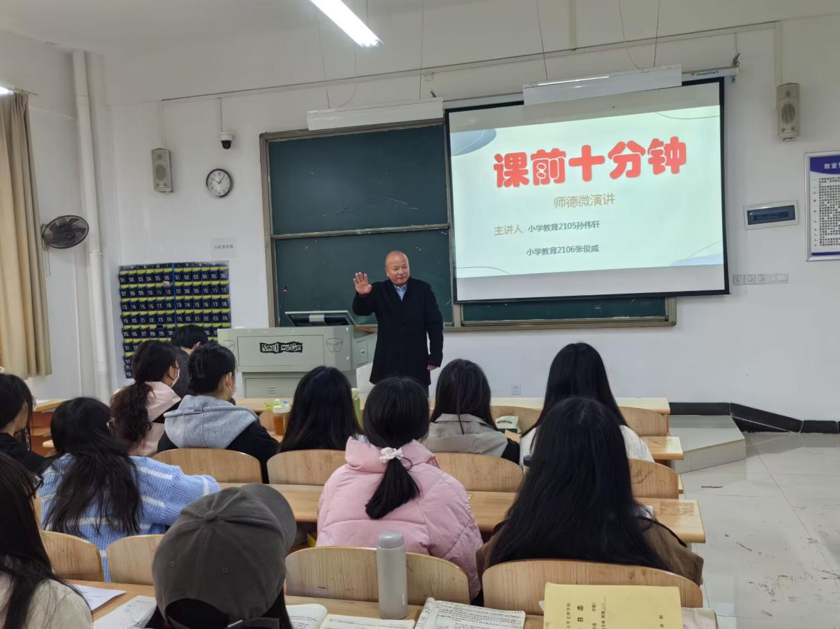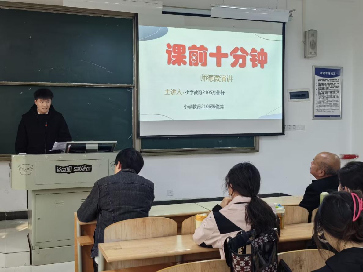 2023年12月6日上午10:00,教育与艺术学部总支书记李先华、全体辅导员一行走进小学教育专业的课堂(1B309),聆听2105班和2106班的“微演讲”,查看“课前十分钟”的建设情况。孙伟轩、张俊威两位同学以“师德”为主题,分别进行了《三尺讲台塑人生,躬行耕耘铸师魂》和《教师的爱》的微演讲。两位同学用标准的普通话和深情地诵读,阐述了人民教师的伟大,并励志成为一名光荣的人民教师。