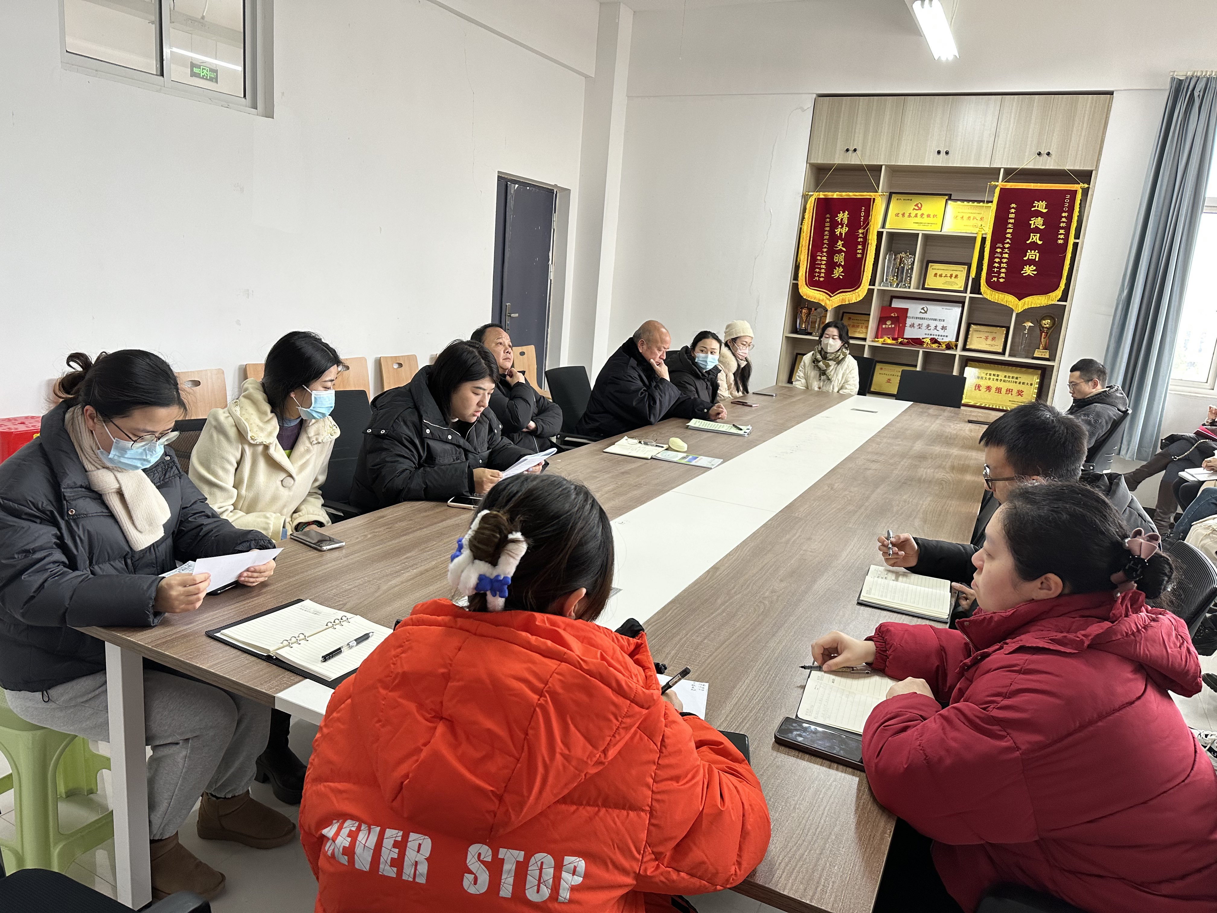 2023年12月19日,教育与艺术学部在1号实验楼414会议室召开了全体教职工期末工作例会,本次会议共有以下四项议程:一、全体教职工集中开展政治理论学习,胡蕾老师领学;二、李先华书记布置了期末考试考纪考风建设、学生安全、就业等相关工作;三、王文主任总结了本年度的主要工作开展和落实情况并统筹安排了学部期末的相关工作;四、各专业教研室组织开展教研室活动。