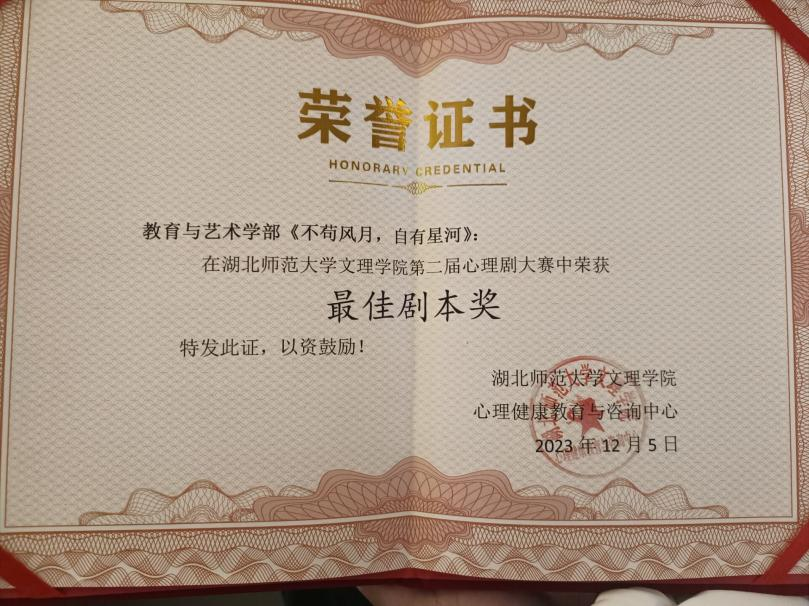 2023年12月5日,大学生心理健康教育与咨询中心在学术交流中心举办的“心如花木,向阳而生”为主题的心理剧决赛,我学部小学教育2202班杨璨宇等9位同学,演绎的《不苟风月,自有星河》心理剧荣获一等奖和最佳剧本奖。特此祝贺!
