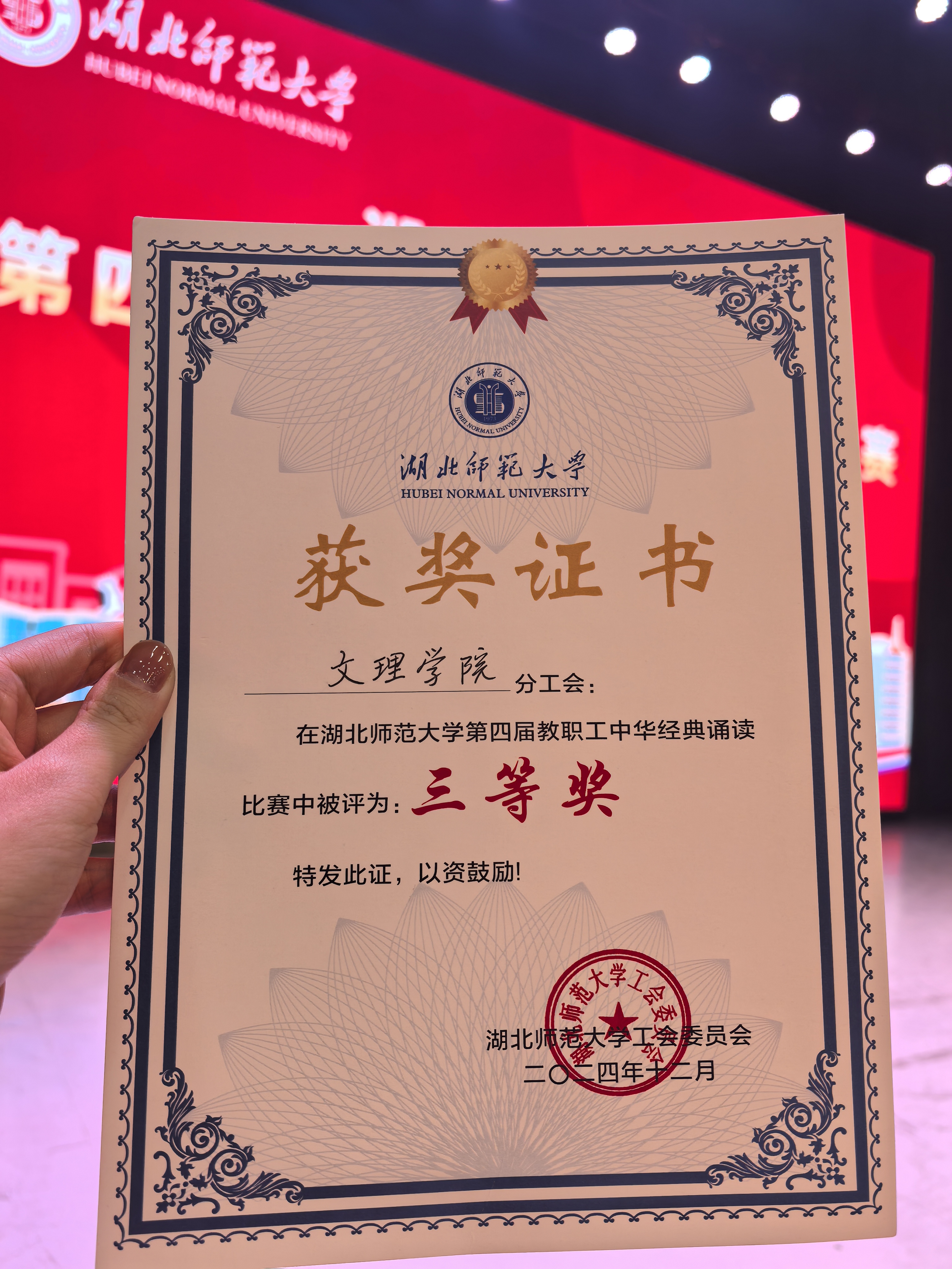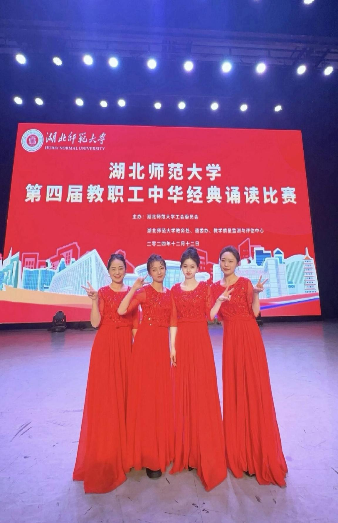 教育与艺术学部梅冰清、李雅欣、唐晨和招生办边婷婷四位老师组合的团队,在2024年12月12日下午15:00,由湖北师范大学工会委员会、湖北师范大学教务处、语委办、教学质量监测与评估中心主办的“湖北师范大学第四届教职工中华经典朗诵比赛”中荣获三等奖,特此喜报。