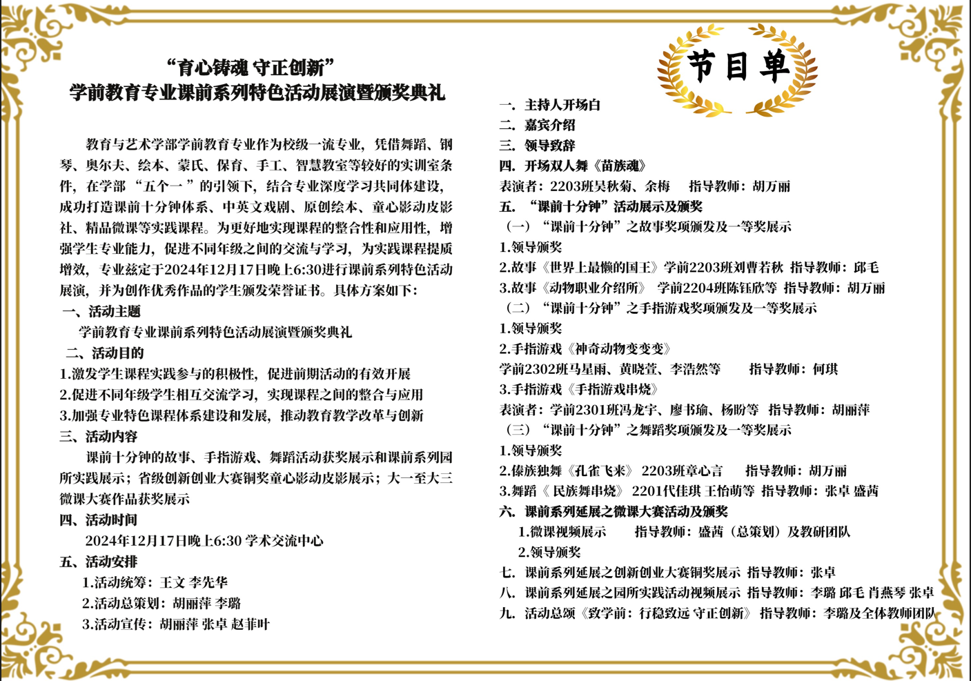为加强学前教育专业在课程建设、实践教学、技能训练、协同培养方面的建设,确保“五个一”工程的落实。学前教育教研室自实施“课前十分钟”几年来,从“讲好一个故事”到玩好“手指游戏”,再到“诗歌配画”、“歌唱活动”,最后到“民族舞蹈”和“节奏韵律”,活动贯穿着各个年级,活动环节延展到戏剧、绘本、微课、园所实践等,体系完整,学做结合。2024年12月17日晚6:30,学前教育专业在学术报告厅面向全校师生进行课前系列活动展演和颁奖典礼。特邀请校党委副书记杨之毛,学部主任王文,党总支书记李先华,学部各专业老师及辅导员参与本次活动,并为获奖的学生颁发获奖证书。活动安排井然有序,节目环节紧凑,内容丰富多彩,赢得了现场观众一致的好评,同时活动过程由万搏app官方版下载招生办抖音账号和微信公众号进行同步直播。