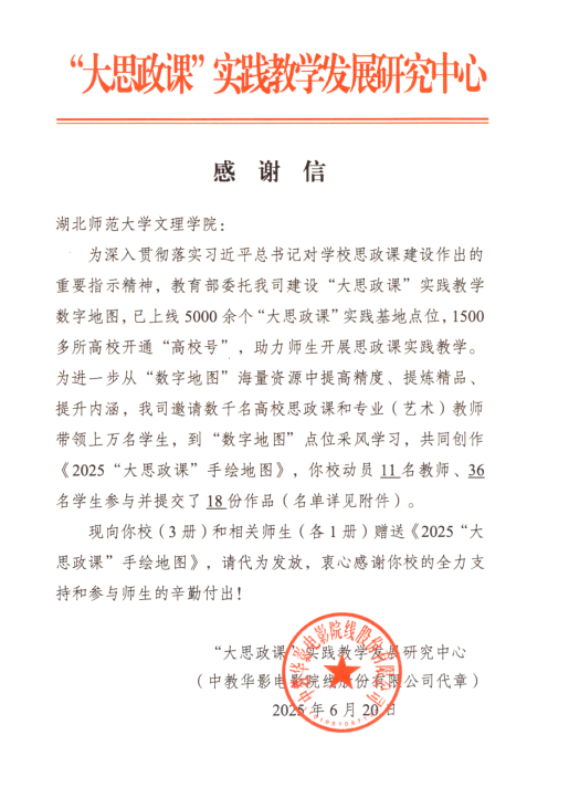 近日,“大思政课”实践教学发展研究中心与中教华影电影院线股份有限公司联合向万搏app官方版下载发来感谢信,对学校积极参与《2025“大思政课”手绘地图》创作工作、助力“大思政课” 实践教学发展给予高度认可与诚挚感谢。